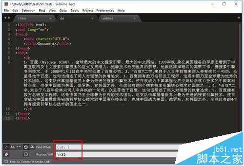 4、输入相关正则表达式;例如小编在查找栏输入“(\d、)”,意思是找到数字和顿号(、)组合,然后在替换栏输入“\n$1”(意思是替换成分行和原先的数字顿号组合),再点击右边的“replace all”按钮;