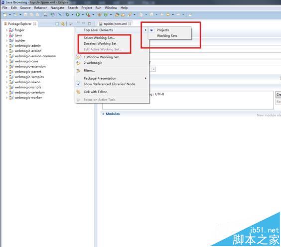 1、启动Eclipse。在Eclipse的左侧是PackageExplore,点击PackageExplore右上角的ViewMenu菜单,可以看到Package Explore的两种展现方式:Project和Working Set。