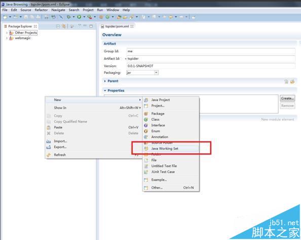 3、新建Working Set。在Package Explorer的空白处单击右键,在弹出菜单中依次选择New -> Java Working Set。