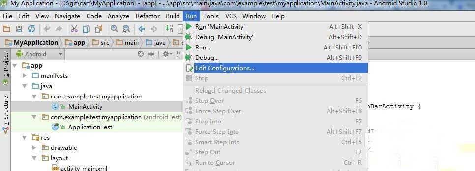 4、在MainActivity上点击右键->"Run 'MainActivity'"。