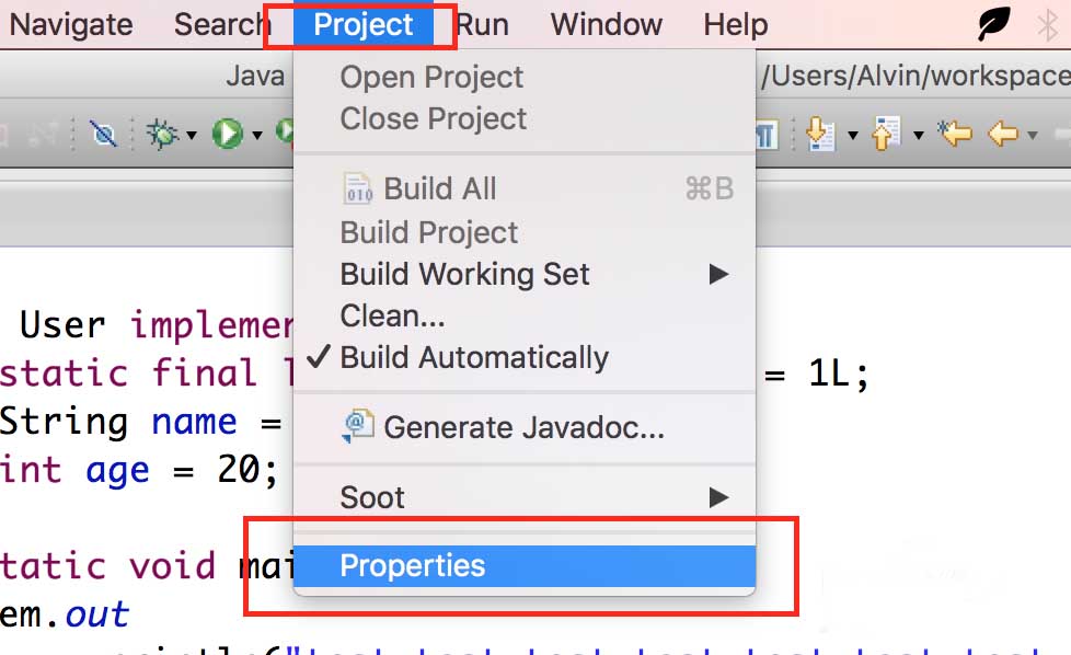 2、进入工程属性设置页面。点击菜单上的"Project(工程)"->"Properties(属性)",进入工程属性的设置页面