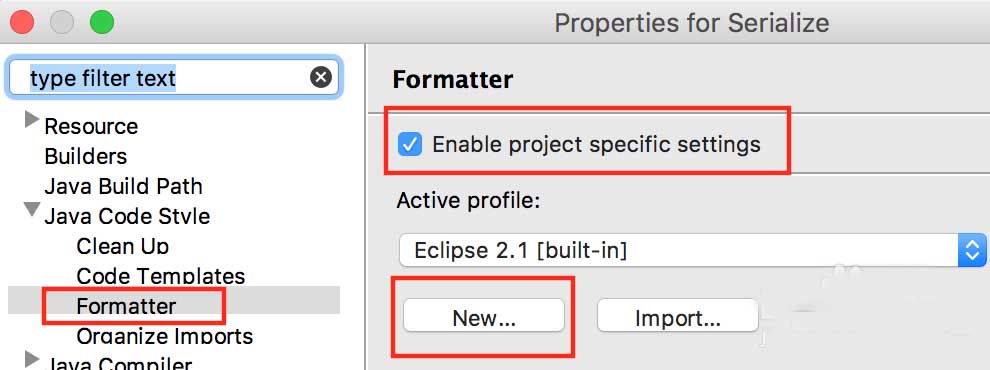 3、启用自定义的自动化排版样式。点击左侧选择栏的"Java Code Style(Java代码风格)"->"Formatter(排版)",看到右侧的页面。然后,勾选"Enable Project Specific Settings(启用工程配置)"选项,再点击"new(新建)"按钮,来设置自定义的代码风格。