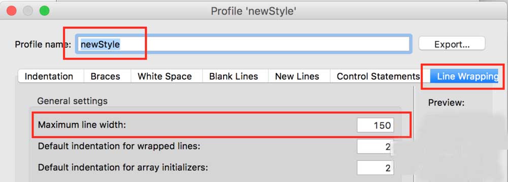 5、设置行宽的最大值。点击右上角附近的"Line Wrapping(行截断)"标签页,在"General Settings(通用设置)"下设置"Maximum line width(最大行宽)"的值,从默认值80改成150,保存设置。