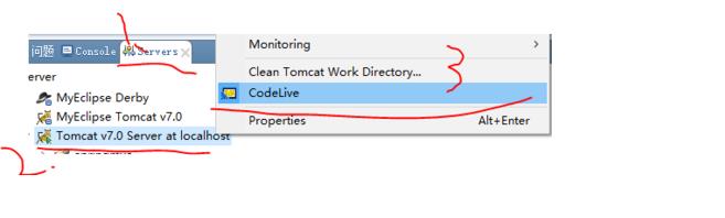 2、在Servers视图中找到运行的服务器类型(我的是Tomcart7.0),右键选择CodeLive并单击。问题解决。。。