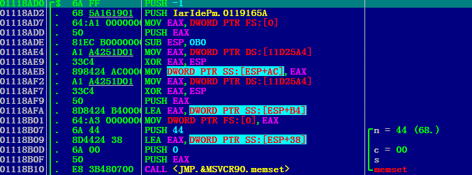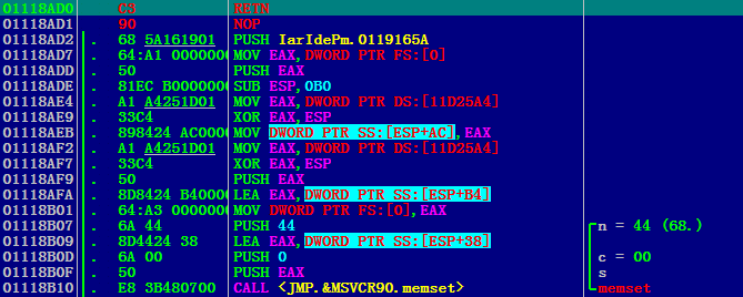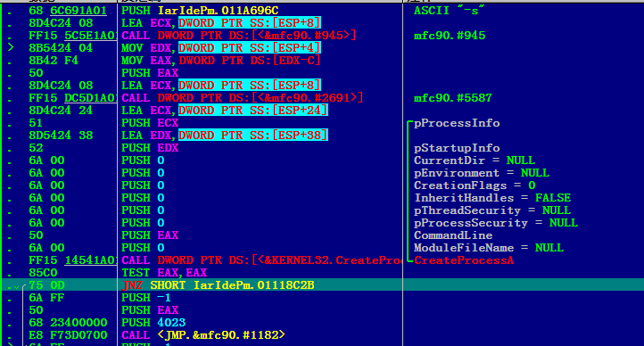 OD直接加载IarIdePm.exe,设断点 bp MessageBoxA ,F9跑起来,断在user32.MessageBoxA,CTRL+F9 出现提示对话框,点击确定,CTRL+F9,F8 一直运行到IarIdePm.exe 代码段,发现如下代码: