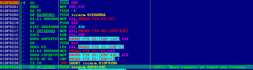 在安装目录下找到arm\bin\iccarm.exe程序,OD载入,搜索字符串 ,找到"Must request at least one license.",定位到代码行: