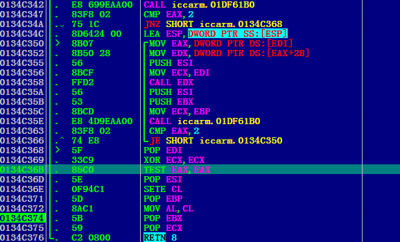 先判断返回值eax是否为2,不为2的话ecx置0,然后判断eax是否为0 若eax=0则cl=1,若eax!=0则cl=0 最后在eax=cl返回