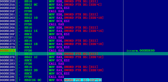 在函数入口下断,F9运行程序,到达断点,ALT+K打开调用堆栈窗体,层层堆栈分析,发现可疑代码:
