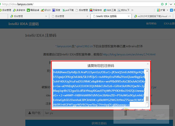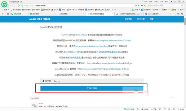 6.之后打开浏览器输入“http://idea.lanyus.com/”,点击获取注册码,如下图所示。