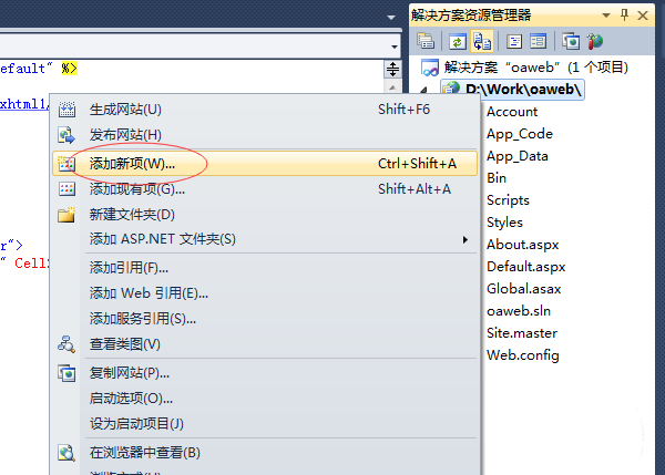 2、在右侧解决方案中选择添加一个新项,如下图所示,或者在一个既有的页面中增加功能也可以。