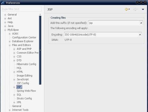 1、Window -> Preferences -> MyEclipse -> Files and Editors -> JSP。