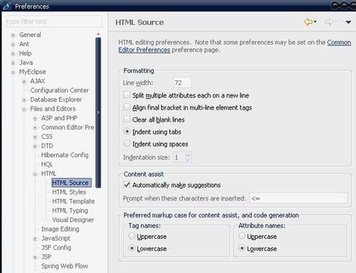 1、Window -> Preferences -> MyEclipse -> HTML -> HTML Source;