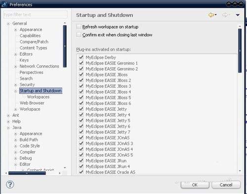 在MyEclipse编译器下: 首先进入Windows –> Perferences–> General–> Startup and Shutdown 。我只保留了如下项:顺序下来