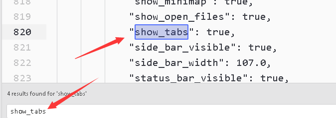 3、然后使用编辑器 打开这个文件 ,在文件中搜索show_tabs将所有的show_tabs 对应的false改为true (所有的 一共有四个 都要做更改) ,然后保存退出,重新开sublime,就会显示标签页了。