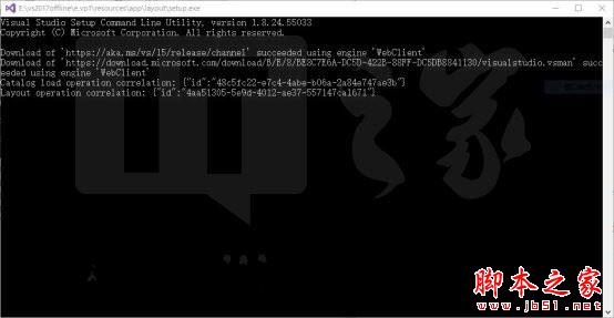 ③根据自己下载的VS2017版本,在打开的命令提示符窗口输入下面对应的命令并点击回车,等待程序启动即会开始下载(以下命令用于下载完整版离线包,包含全功能以及全语言包,其中红色部分为下载文件存放路径,根据自身情况用户可自行更改)