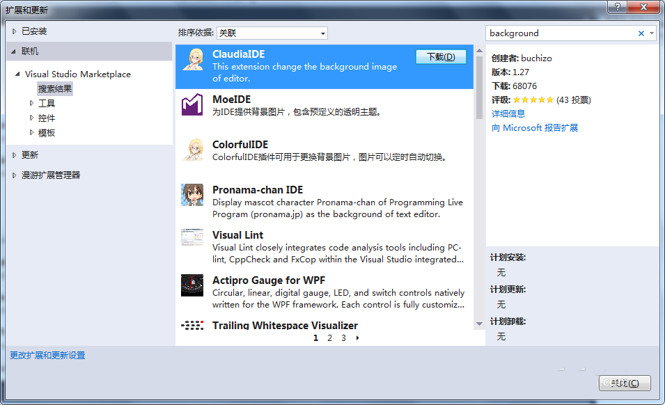 3、根据自己的喜好,可以选择其中的一个插件,进行下载安装,下载完成后会有提示关闭VS2017。关闭后出现此界面。