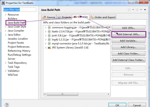 右击“项目”→选择Properties,在弹出的对话框左侧列表中选择Java Build Path,如下图所示:选择Add External JARs,就可以逐个(也可以选择多个jar,但是限制在同一个文件夹中)添加第三方引用jar包。