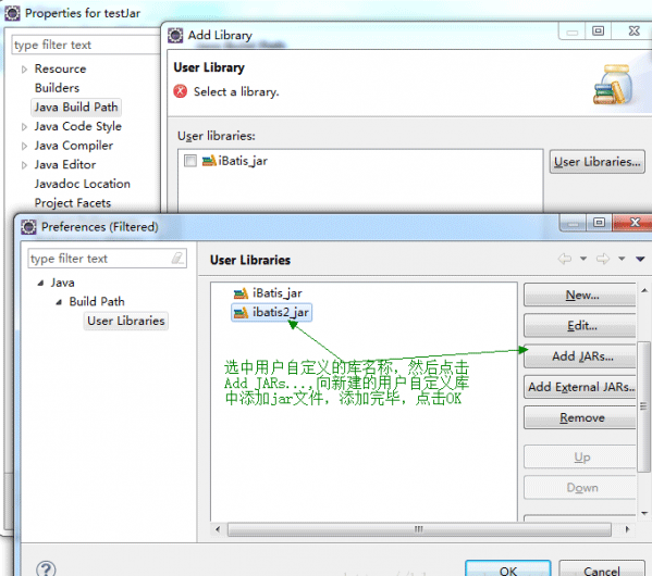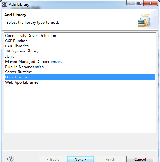 右击“项目”→选择Properties,在弹出的对话框左侧列表中选择Java Build Path,弹出如上图所示的对话框,这里选择"Add Library",弹出如下图所示对话框,选择"User Library",然后选择→Next