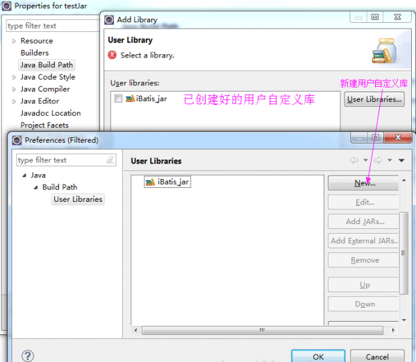 在出现的对话框中,可以选择已经创建好的用户自定义库,也可以选择User Libraries,弹出的新对话框中选择"New",创建新的用户自定义库。