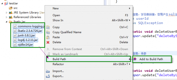 选中需要添加到项目中的jar包,右键选择"Build PathàAdd to Build Path",这样Jar包就成功导入到项目中了。
