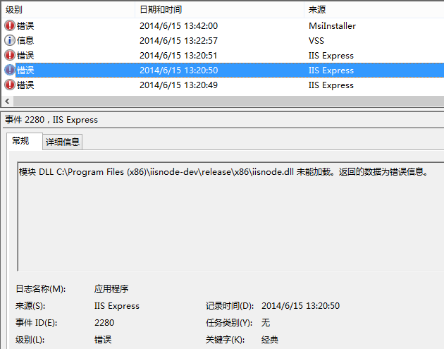 问题焦点已经很清楚了,就是IIS Express未能启动。于是想到查看事件,看有没有记录更具体的日志。