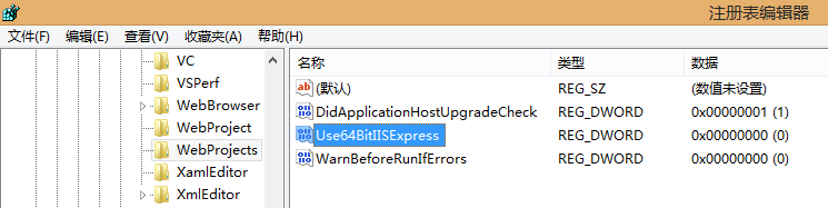 首先,我们之前调试报错是因为注册表中缺少这一项“Use64BitIISExpress”,安装WebMatrix3.0会在注册表中默认写入这一项。不管是调试32位还是64位,