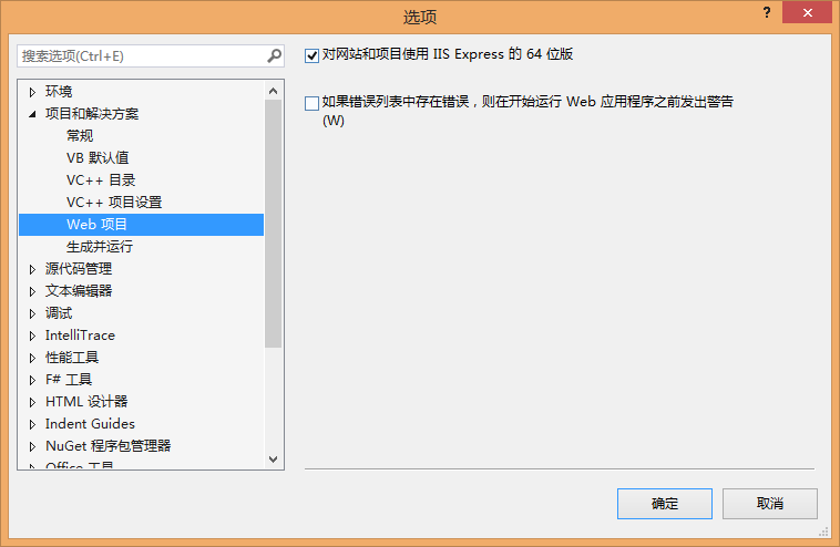 如果我们想在Visual Studio2013上调试64位ASP.NET MVC的网站(本机环境X64),需要把IIS Express设置成默认的64位开发服务器。