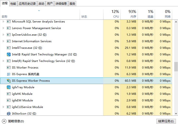 修改完成,按F5成功运行网站程序后,我们可以在任务管理器的进程项中看到IIS Express的进程后不带32的字样,说明当前启动的为64位。下面附两张图作对比: