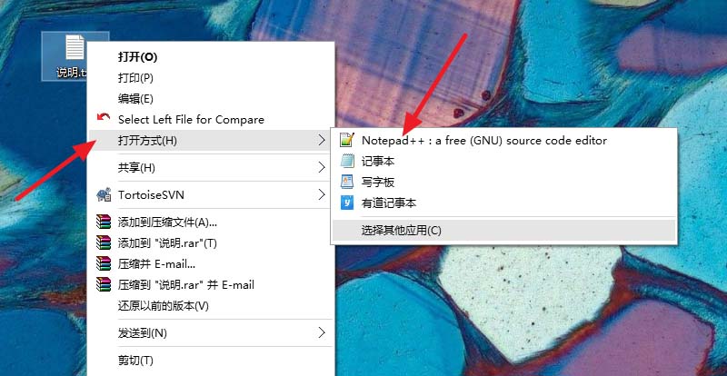 2、首先用notepad++打开文本文件。如图,选择一个文本文件后右键点击,在出现的菜单中选择打开方式为notepad++。