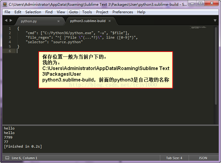 (3)配置完后,就可以新建一个python文件并运行试下了。注意CTRL+S为保存py文件,CTRL+B为编译运行。
