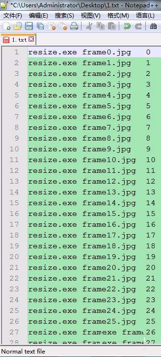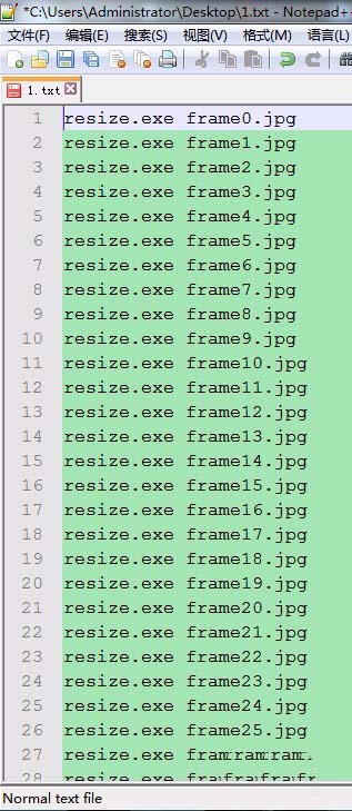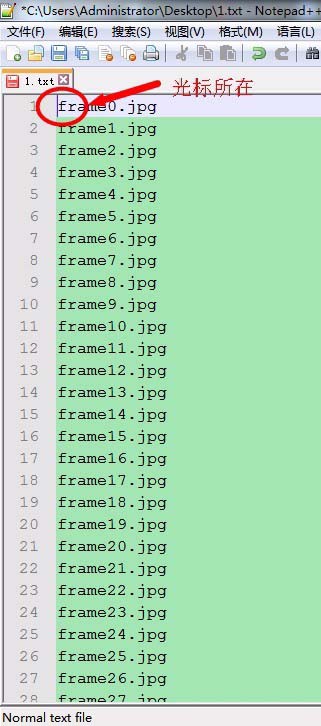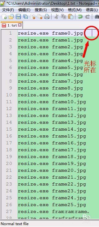3、如果想往每一个文件名前加上字符串 “resize.exe”,一行一行去加显然是耗费精力的,这时就需要用到列块编辑了。首先将光标定位到要插入字符串的第一个位置处,如图