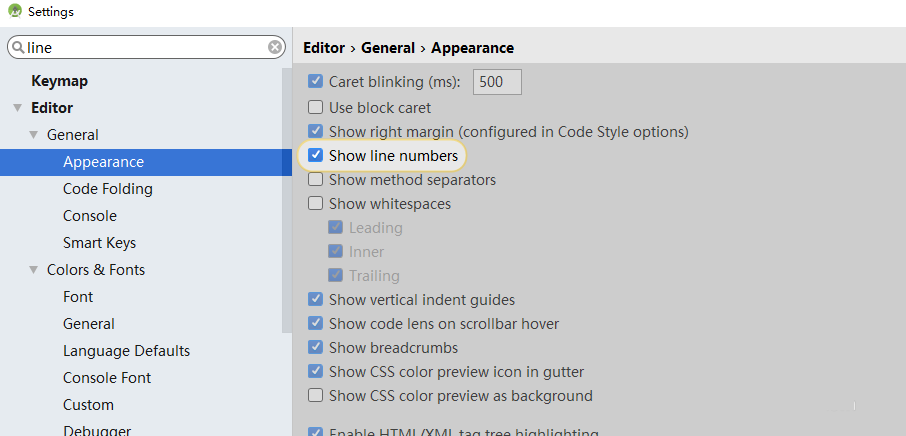 3、在设置页面左上方的输入框中输入“line”,按回车键搜索。然后选择Editor→General→Appearance,选中右边的Show line numbers
