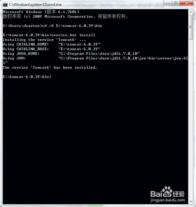 打开命令提示符——输入cd /d E:\tomcat-6.0.39\bin——转到Tomcat的bin目录