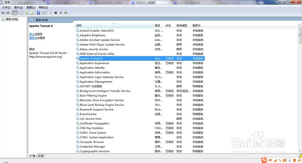 我们还可以打开系统服务查看:WIN+R——输入services.msc——回车——找到Tomcat服务,从这里也可以启动和停止。