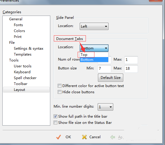4、接着选择右边的Document Tabs下的Location,将下拉框的值选成Top。