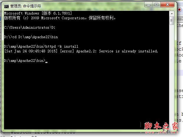 2、httpd -k install 输入该命令后查看服务是否安装成功