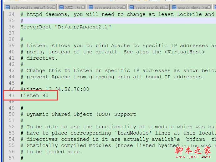 打开apache目录下的conf/httpd.conf 搜索 "Listen 80"