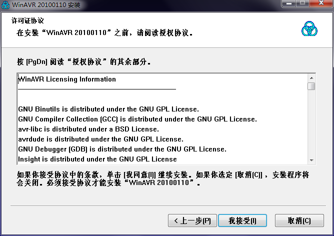 WinAVR在GNU GPL许可协议下发布。接受许可协议,以继续安装。