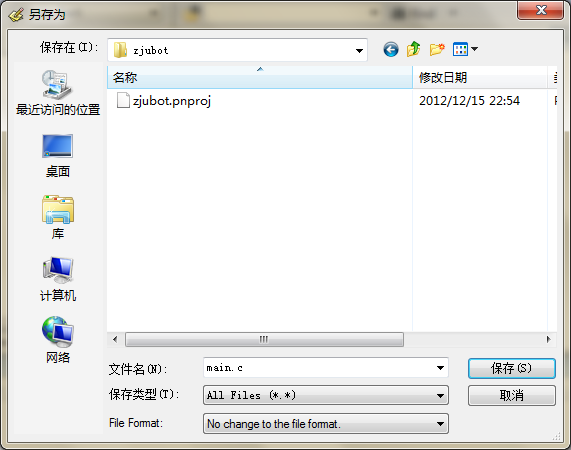 我们可以先随意输入一些文本,然后保存。保存按钮在工具栏的左侧,也可以再“File”菜单里选择“Save”。注意文件的保存的文件夹最好与前面项目文件夹一致。文件名以“.c”结尾可以帮助Programmer's Notepad识别代码类型。