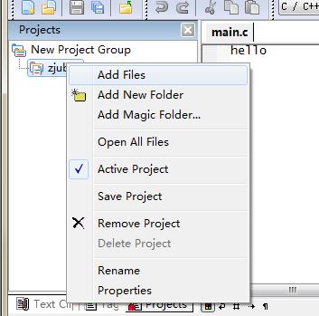 然后,我们就可以将此C源代码文件包含到项目中去了。右击窗口左侧项目面板中的我们前面新建的项目,在右键菜单中选择“Add Files”。之所以要将C代码文件添加到项目中,是为了便于项目的管理。