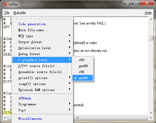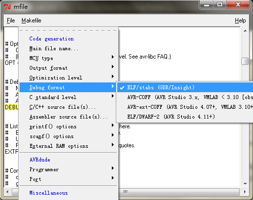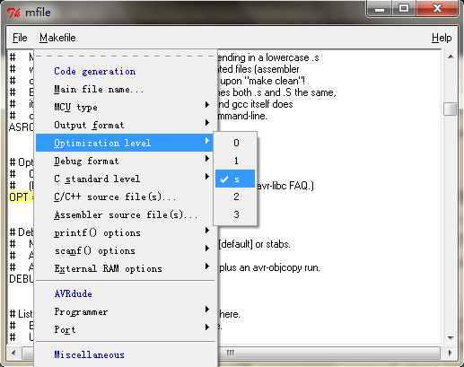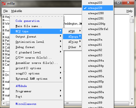 当你选择了选项之后,会发现Makefile文件多了一行“MCU = atmega128”。这个小程序的作用就是在你通过菜单修改选项时,同步修改makefile文件。
