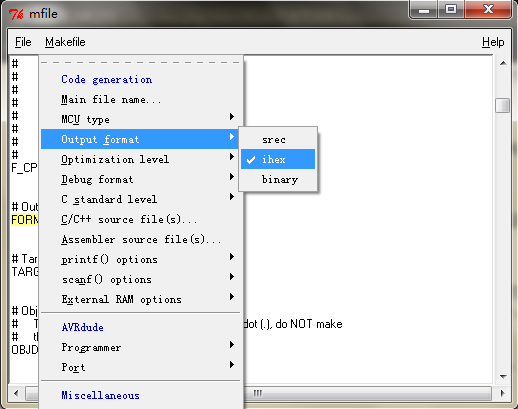 然后是Output format,即编译输出的文件类型。这里我们选择ihex(十六进制文件),这种文件可被下载程序下载到单片机中。
