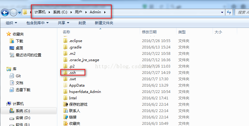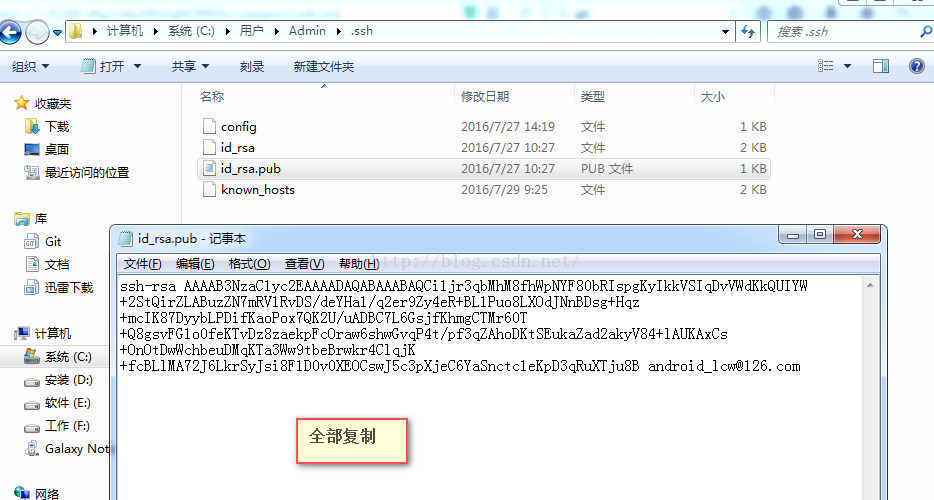 6、打开Admin目录进入.ssh文件夹,用记事本打开id_rsa.pub,复制里面的内容添加到你github或者bitbucket ssh设置里即可