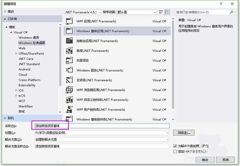 2、在新建项目界面中,选择语言为visual C#,在Windows经典桌面下新建一个窗体应用程序,设置项目名为“添加其他项目窗体”;