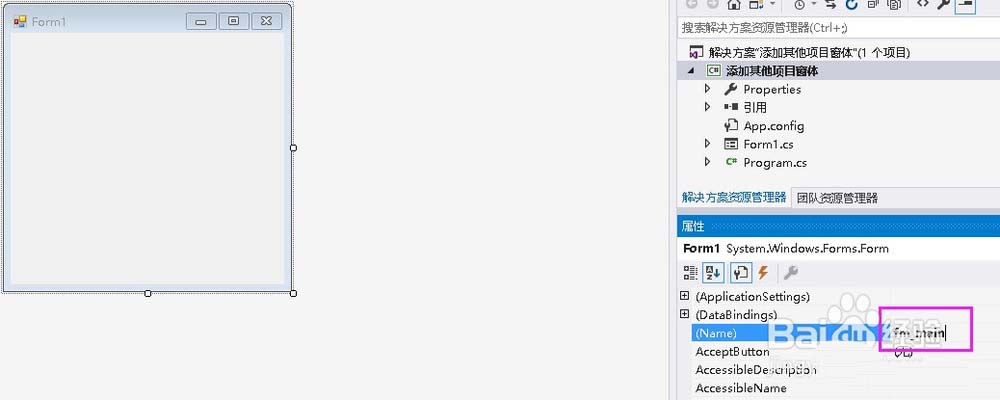 3、进入新建的项目,将窗体name属性设置为“fm_main”,窗体类改成Formmain.cs