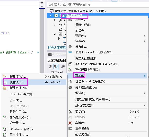 4、在解决方案中,选中项目“添加其他项目窗体”右键,添加现有项。