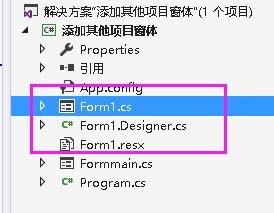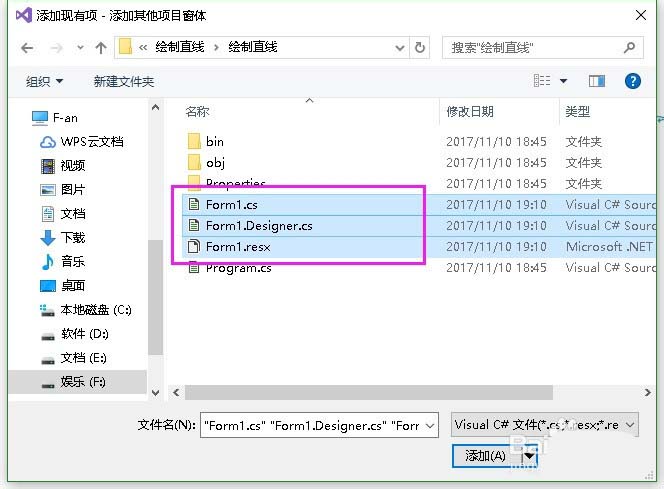 5、我找了一个我以前写的绘制直线这个项目,将这个项目中的Form1这个窗体添加到本项目来。需要注意的是添加的文件包括窗体的设计文件和代码文件。这里我需要将红框选中的三个都添加上。
