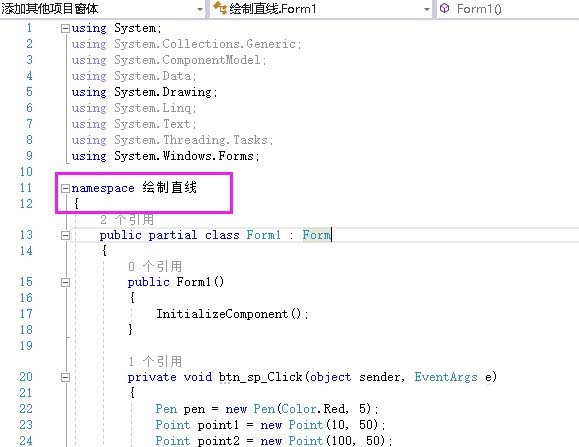8、我们刚才添加的是“绘制直线”这个项目的form1窗体,那么我进入这个文件看看他的命名空间是“namespace 绘制直线”,和本项目不在同一命名空间下。