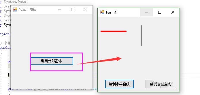 10、编译运行程序,单击“调用外部窗体”。是不是可以看到调用了“绘制直线”的这个窗体呢。