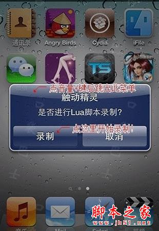 1、首先我们要运行触动精灵工具,然后回到主菜单,只要点击设备的【音量+】键,就可以弹出一个菜单,再次点击【录制】就会开始录制脚本了;